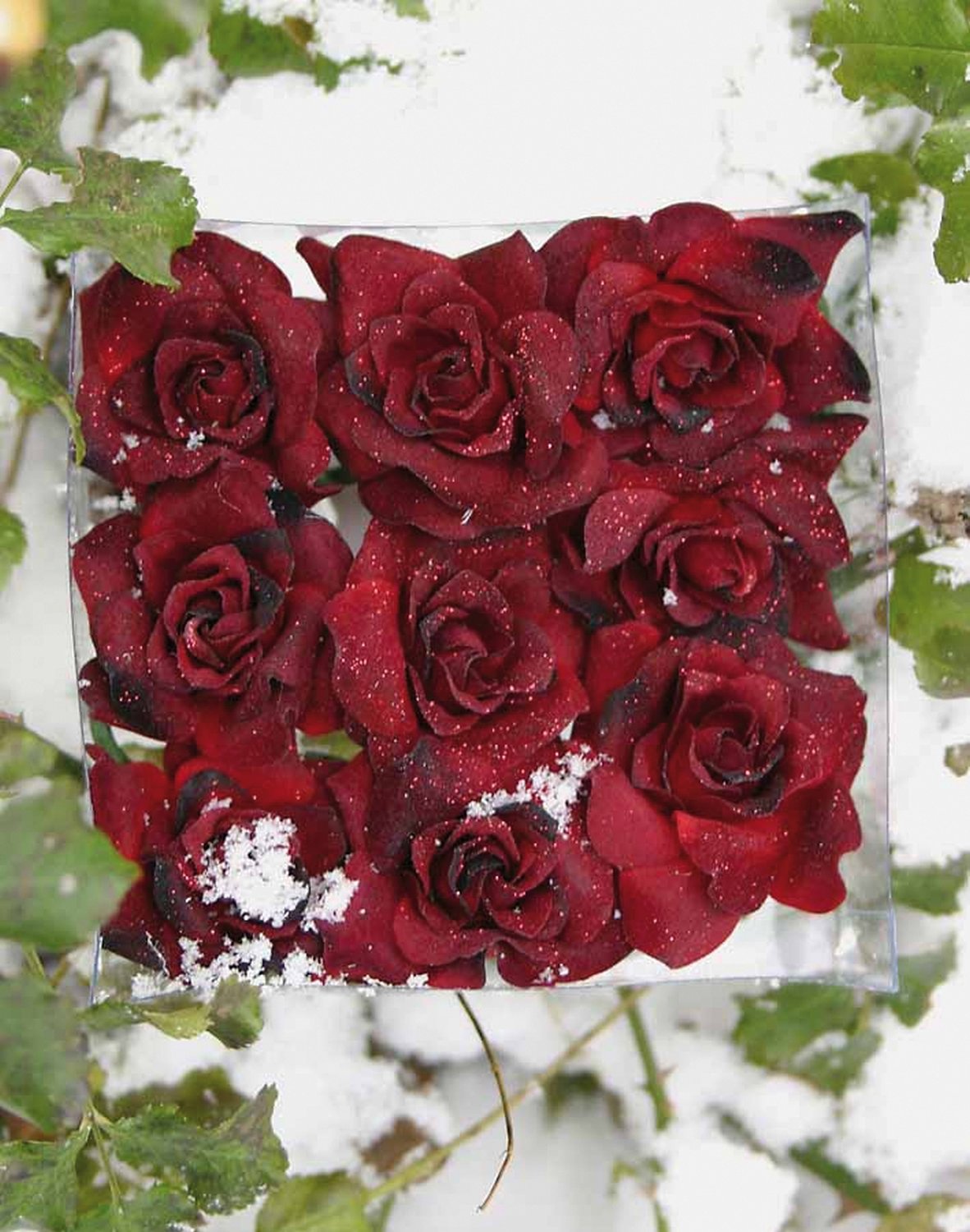 Product information "Artificial rose heads 'velvet / glitter' on wire, 9 pieces in box, burgundy-gold"
