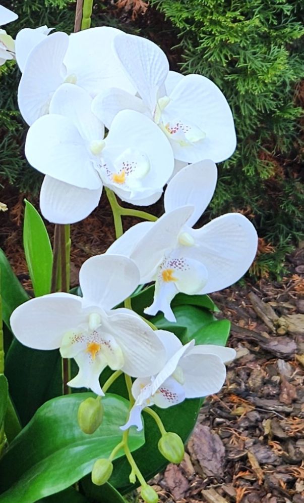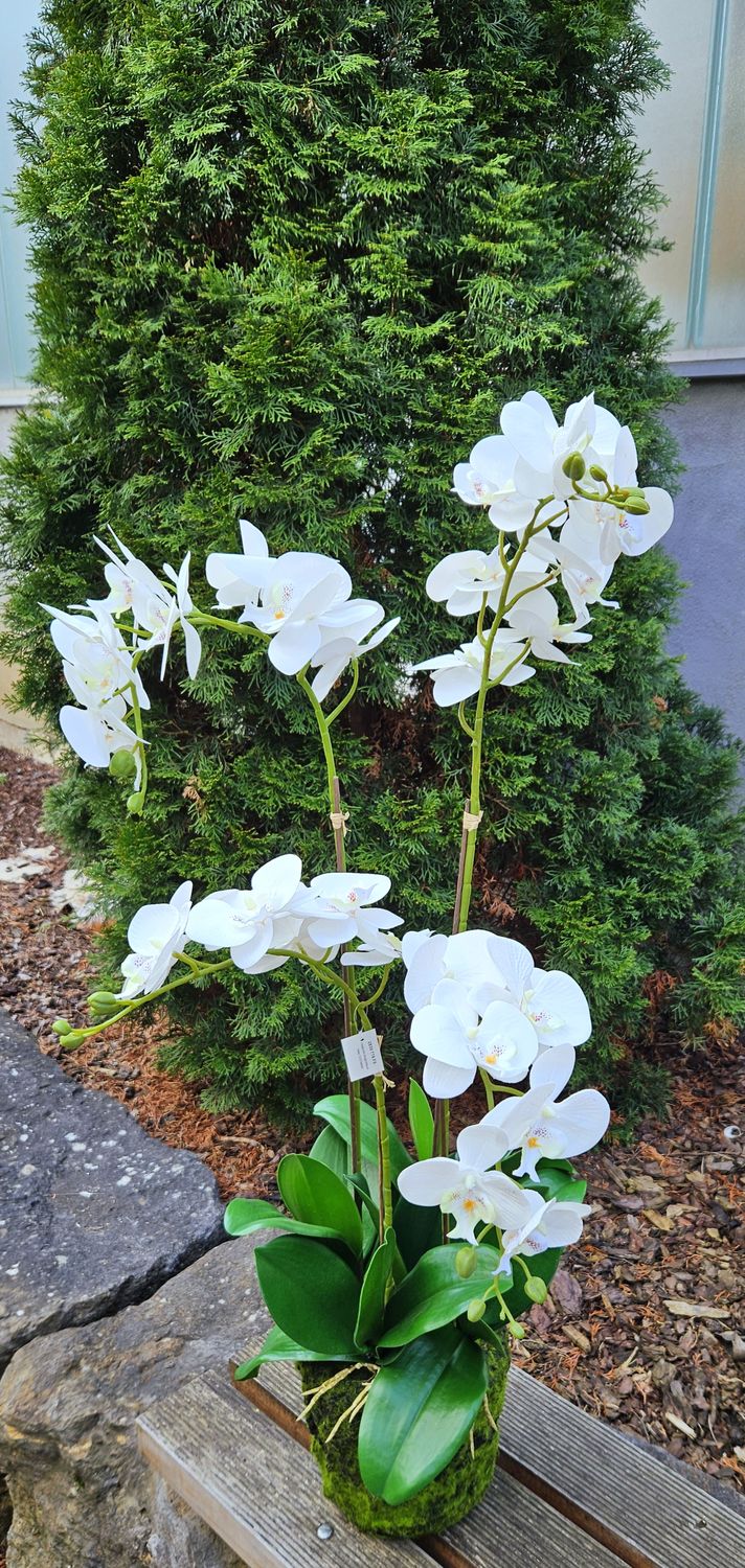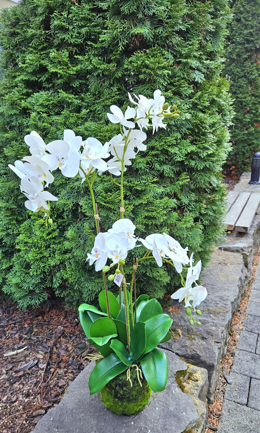 Información sobre el producto "Arreglo floral artificial con orquídeas en tierra, 110 cm, Real Touch, blanco crema"