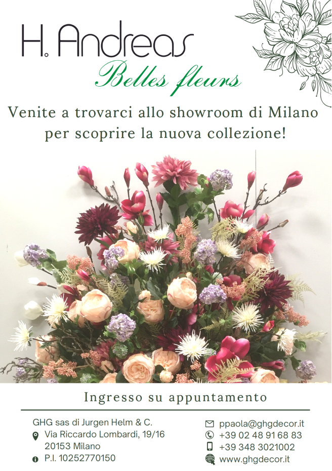 A partir de ahora, nuestros (futuros) clientes pueden ver la calidad y la variedad de nuestras flores artificiales en directo, no sólo en Alemania. La nueva sala de exposiciones de Milán ofrece a los clientes una visión de la amplia gama de flores artificiales de H.Andreas. El equipo de GHG se complace en invitarle a su sala de exposiciones.
